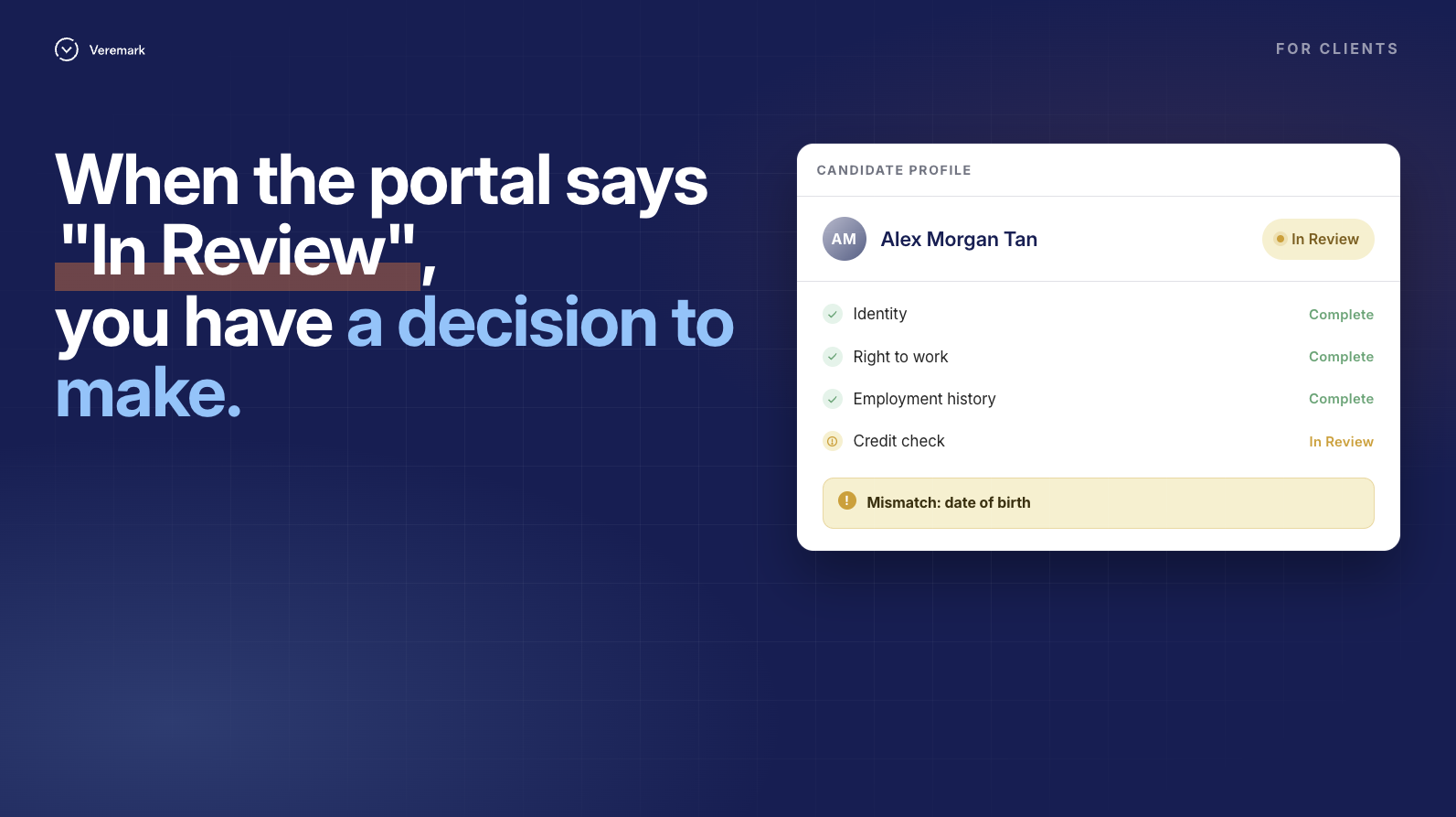 When you open the candidate's profile in the portal, the status will show as "In Review". A note on the report will explain the specific mismatch and what needs to happen next. It will read something like: