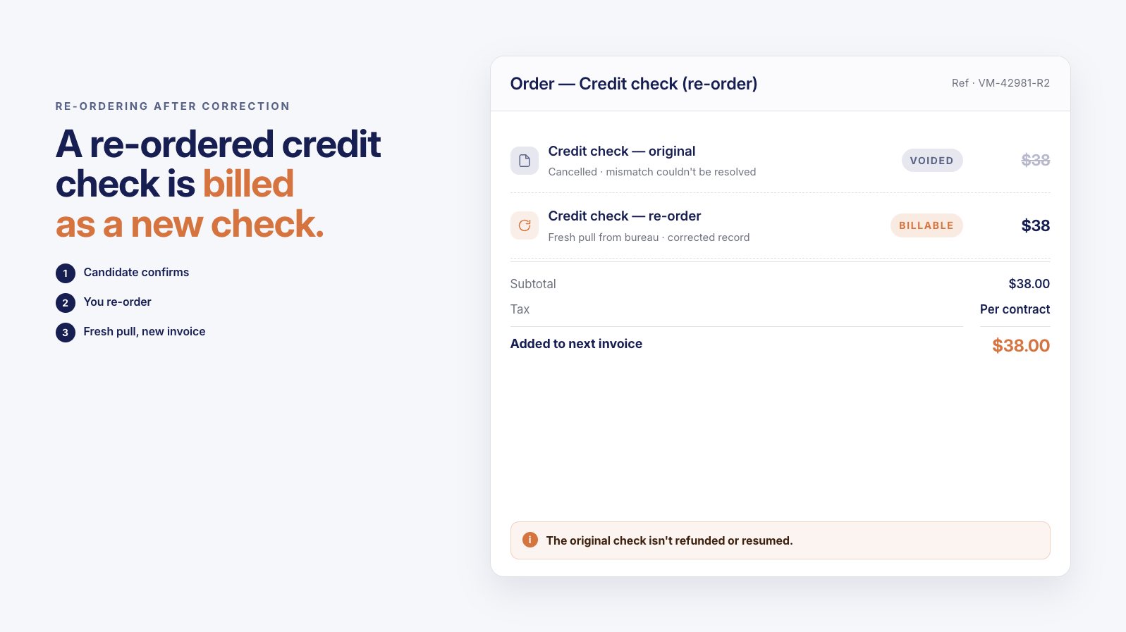 Please note: a re-ordered credit check is billable as a new check. The original check cannot be completed without a clean report from the bureau, so the updated pull is treated as a separate order.